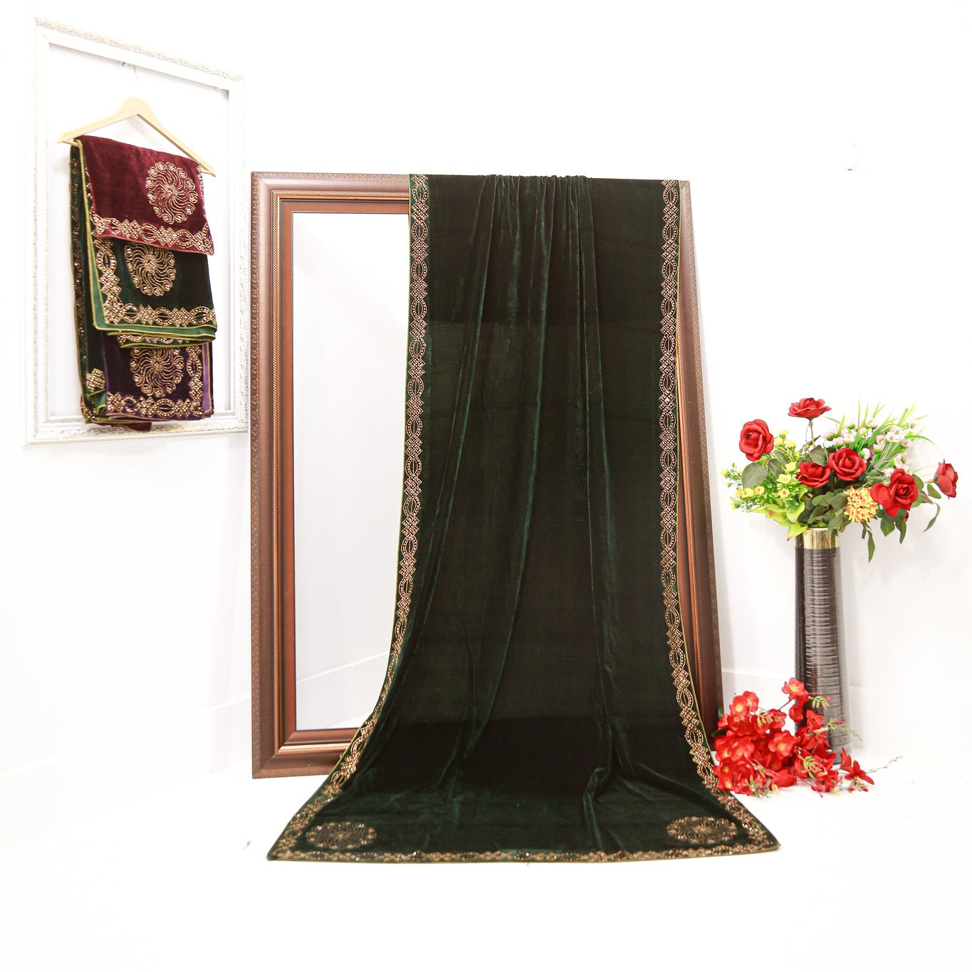 Enhance your festive and evening looks with this Limaara Nug Stone Work Velvet Shawl, beautifully crafted to add a touch of shimmer and sophistication. The soft velvet fabric paired with finely placed nug stones creates a graceful, eye-catching finish—perfect for weddings, celebrations, or winter outings.